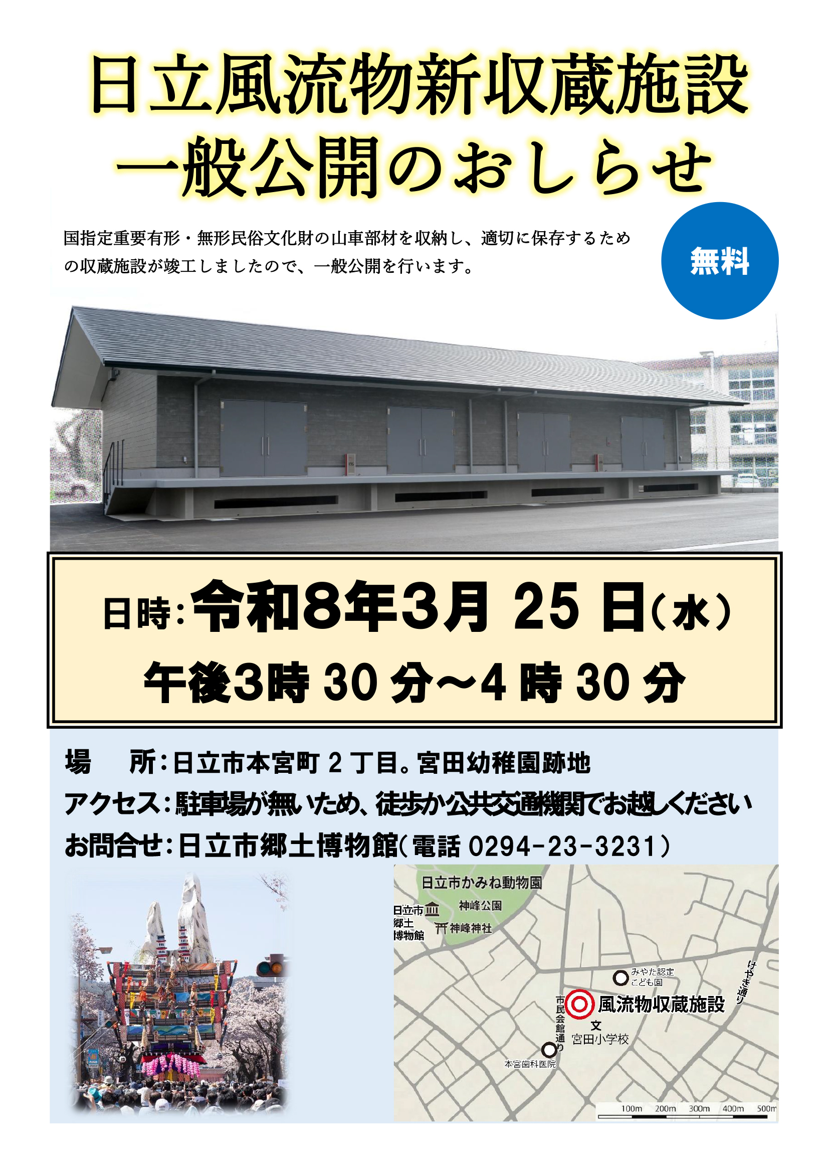お知らせ ホーム > お知らせ一覧 > イベント・募集 > 日立風流物 新収蔵施設 一般公開のお知らせ イベント・募集 202603.17 日立風流物 新収蔵施設 一般公開のお知らせ 前の記事へ イベント・募集一覧にもどる